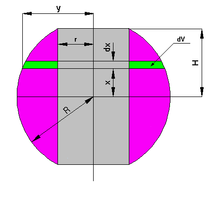 If we call H the dimension from the centre of the sphere to one of the flat ends, R the sphere radius, r the cylindrical hole radius and x the distance from the centre of the sphere to some plane normal to the cylinder axis (refer attached picture). This plane intersects the sphere at a distance y from the axis.
